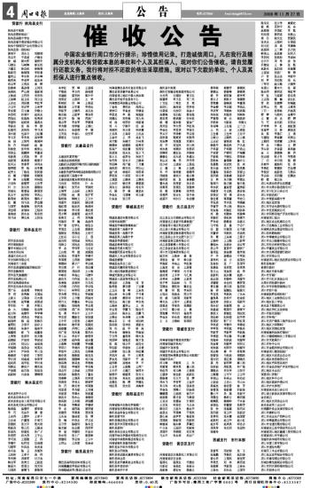 | | 催 收 公 告 | | 中国农业银行周口市分行提示:珍惜信用记录,打造诚信周口。凡在我行及辖属分支机构欠有贷款本息的单位和个人及其担保人,现对你们公告催收。请自觉履行还款义务,我行将对拒不还款的依法采取措施。现对以下欠款的单位、个人及其担保人进行重点催收。 | | |