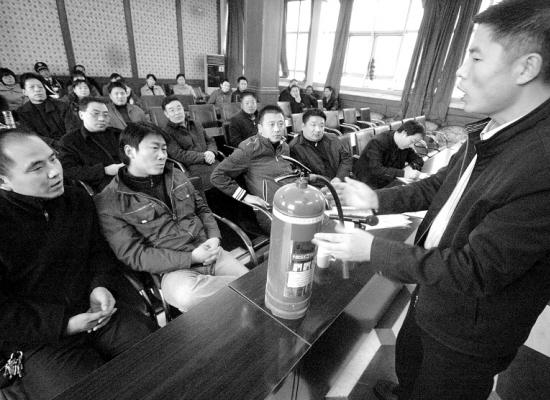 ▲为形成人人重视消防、参与消防的浓厚氛围,省消防协会科普教育咨询中心组织专业教员,为我市各单位讲解隐患排查、初期火灾扑救、人员逃生自救知识。图为教员在周口日报社讲述灭火器应用技术。 (记者 李寒 摄)