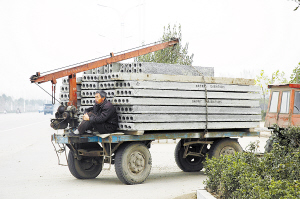 近日,一辆车拉着楼板从市区东环路经过,一名男子在没有任何安全措施的情况下坐在车尾部。行人无不为他捏了一把汗。