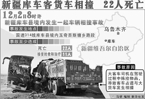 据新华社乌鲁木齐12月2日电 截至2日19时,在新疆库车县境内客货车相撞事故中死亡人数已增至22人。据当地交警部门初步调查,事故系大客车司机在驾驶过程中拣拾物品、导致客车占道与大货车发生相撞而致。 经交警部门调查,车牌号为新P-02879的大客车司机行至国道314线库车县境内玉奇吾斯塘乡路段时,俯下身拣拾掉在车内的物品,车身侵入相向