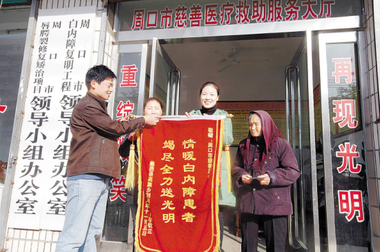 自开展“曙光行动”以来,我市已为6650名农村患者成功实施了白内障复明手术。昨天上午,一名患者在复明后,将一面锦旗送到市慈善总会工作人员的手中。(记者 王映 摄)