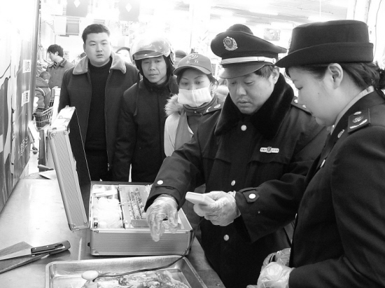 ▲冬季来临,沈丘县采取有效措施,加大对食品销售市场的监管力度,确保让广大群众吃上放心食品。图为该县工商人员在超市向消费者介绍食品的鉴别方法。(赵文学 张广明 摄)