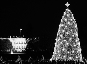 12月4日,位于美国华盛顿白宫前的国家圣诞树被点亮。美国第一夫人劳拉·布什表示,今年打算使用节能灯泡和往年使用过的材料装饰白宫,度过一个节俭的圣诞节。