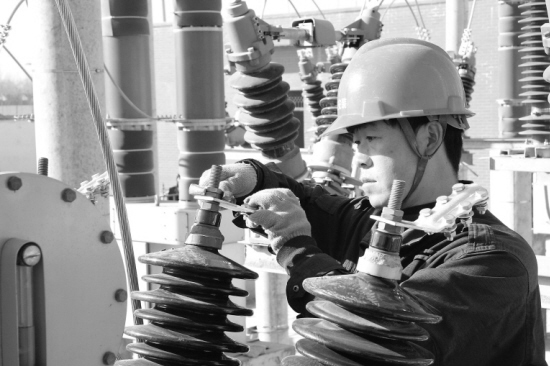 ▲日前,鹿邑县电业局检修人员在为东关35千伏变电站更换高压短线夹。入冬以来,该局把冬季安全用电作为大事抓紧抓好,对全县11座35千伏变电站进行了检修,对老化和存在安全隐患的设备进行了更换。(张文杰 杜鲲鹏 摄)