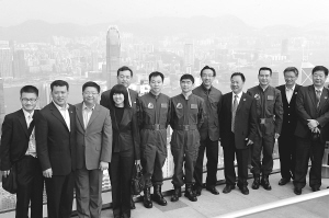 12月7日,中国载人航天工程副总指挥张建启(右四)、航天员翟志刚(右三)、刘伯明(右六)、景海鹏(左六)等在太平山顶观景台合影。当日,正在香港访问的神舟七号载人航天飞行代表团来到香港太平山顶参观。 新华社记者 黄本强 摄