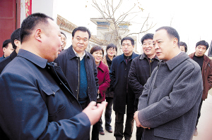 上图为毛超峰向商水县城关乡大刘行政村的村干部了解情况。