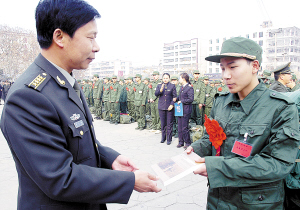 近日,军分区领导向入伍新兵发放书籍《钢铁是怎样炼成的》,鼓励他们走进军营后努力锻炼自己,为家乡人民争光,为国防建设出力。12月10日,我市举行2008年度欢送新兵入伍大会,今年刚入伍的450名新兵将奔赴军营,报效祖国。 记者 孙安平 摄