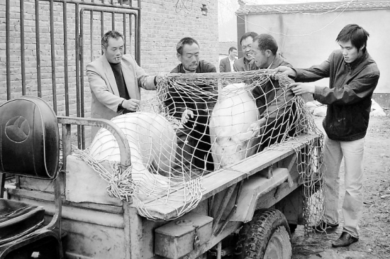 自从推行养殖专业合作社模式之后,项城市永丰乡养殖户的收入得到了大幅提高。养殖专业合作社除为广大养猪专业户提供防疫、饲料、外销等一系列服务外,还为养殖户组织技术培训,竭尽全力为养殖户“保驾护航”。图为商贩正在购买养殖专业合作社的种猪。 记者 王映 摄