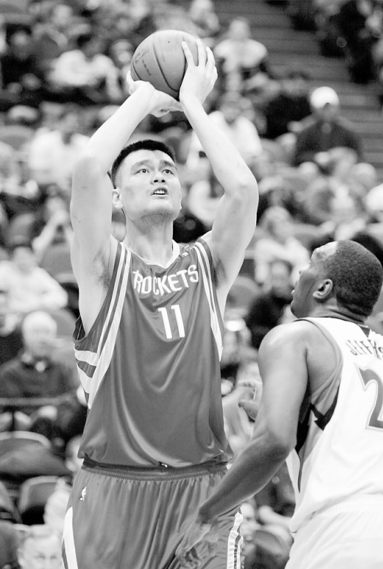 篮球——NBA赛况:火箭胜森林狼 12月20日,火箭队球员姚明(左)在比赛中投篮。当日,在NBA常规赛的一场比赛中,休斯敦火箭队客场以109比102战胜明尼苏达森林狼队,取得三连胜。 新华社发