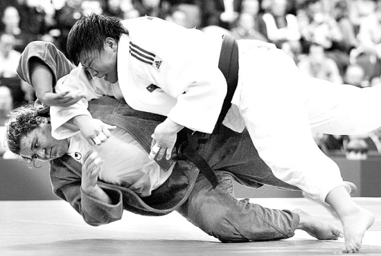 12月20日,中国选手秦茜(上)在比赛中。当日,首届世界无差别级柔道锦标赛在法国巴黎市郊勒瓦卢瓦举行,中国选手秦茜在女子组淘汰赛中战胜突尼斯选手尼赫勒,顺利晋级。新华社记者 张玉薇 摄