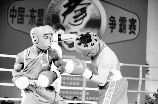 12月20日,中国选手雷务税(右)在54公斤级比赛中战胜菲律宾选手拉里·阿马拉。当日,首届“跨世纪杯”中国—东盟(10+3)拳王争霸赛在广西体育馆开幕,在首日的比赛中,中国选手取得三胜一负的成绩。 新华社记者 闫祥岭 摄