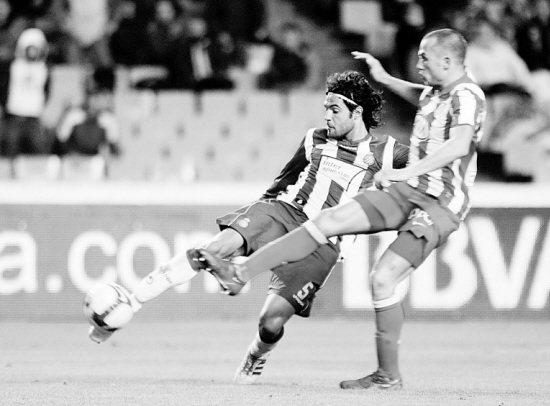 足球——西甲赛况:马德里竞技胜西班牙人 12月20日,西班牙人队球员桑切斯(左)与马德里竞技队球员海廷加拼抢。当日,在2008-2009赛季西甲联赛第16轮的一场比赛中,马德里竞技队客场以3比2战胜西班牙人队。 新华社发