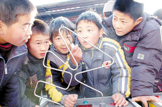 12月24日,在安徽省芜湖县陡村举行的“三下乡”活动现场,孩子们通过科普展品了解科学原理。当天,安徽芜湖市送文化、送科技、送卫生下乡活动启动仪式在芜湖县陡村举行。除了文艺表演、卫生健康服务和送农业科技图书等传统项目外,芜湖科技馆还特意将20件科普展品带到乡间,让农村孩子在家门口体验科技的魅力。(涂志勤 摄)