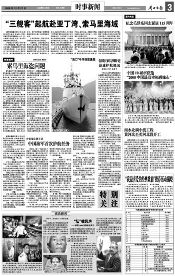 此外,韩国政府已宣布将向索马里海域派遣军舰,加入国际海上军事行动。如计划获得韩国国会通过,韩国军舰将于2009年初部署到位。日本目前也在积极寻求通过特别措施法案,为自卫队舰船进入索马里海域提供法律依据。(新华社北京12月26日电)