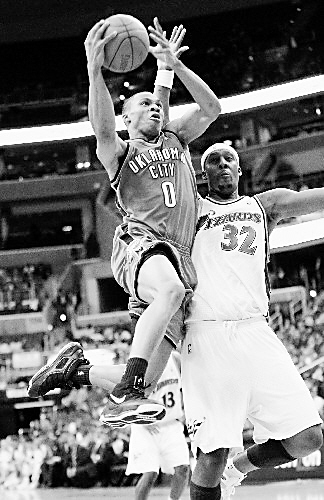 12月27日,雷鸣队球员威斯布鲁克(左)突破奇才队球员布拉奇的防守上篮。当日,在NBA常规赛中,华盛顿奇才队主场迎战俄克拉荷马雷鸣队。 新华社记者 张岩 摄