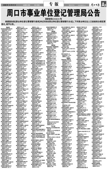 | | 周口市事业单位登记管理局公告 | 周事登告200818号 根据国务院《事业单位登记管理暂行条例》和《河南省事业单位登记管理暂行办法》,下列事业单位法人已经核准办理变更登记,现予公告。 | | |