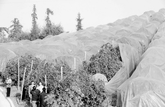 广西“三避”技术富农民 1月3日,游人在阳朔县白沙镇平岭村金橘园内游览。金橘是广西阳朔县特产水果,采用“三避(避雨、避寒、避晒)”技术后平均亩产1418公斤,比传统栽培每亩增产约50%,并使鲜果延长采收期45天,卖价和产值成倍增加。目前广西“三避”技术推广面积已达6857万亩。 新华社记者 陈瑞华 摄