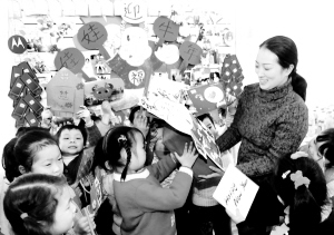 1月8日,南昌市西湖区幼儿园的孩子们把自己用废纸板、彩纸等材料制作的牛年贺卡送给老师,表达新年祝福。 新华社发(袁征 摄)