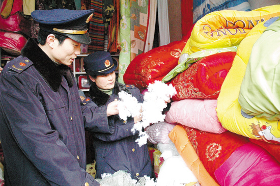 日前,市工商局荷花分局针对荷花市场内的棉制品开展了大型检查活动,打击制售黑心棉的违法行为,防止黑心棉流入市场。记者 王映 摄