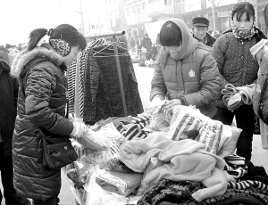 春节临近,我市城乡集贸市场开始热闹起来,市场上各种家用电器、服装、新年装饰品等销售红火。图为群众在集市上挑选衣服。