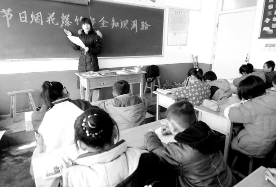 1月13日,山东潍坊幸福街小学的老师在带领学生做烟花爆竹安全知识问答答卷。当日,山东潍坊幸福街小学在寒假前的最后一课中进行节日烟花爆竹安全知识测验,通过测验教育学生在假期中如何正确燃放烟花爆竹,并提倡学生们远离烟花爆竹,保护自身安全。(新华社发)