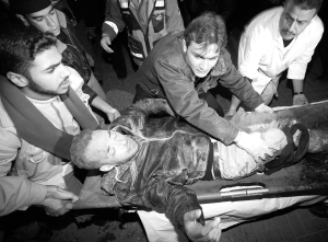 1月14日,救援人员将巴勒斯坦民防组织的一名伤者送往加沙城内的舍法医院。 新华社记者 纳赛尔 摄