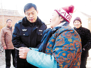 商水县公安局组织民警深入村庄、社区,坚持“三访三查”,把温暖和关爱送给人民群众。全县分5个片区,500余名民警冒着严寒,辗转各个村庄,送身份证上门,走访当事人,征求社会各界意见,慰问军烈属、困难户,为中原大地平添了一份安宁与和谐。图为商水县副县长、公安局长罗海龙为老城区一居民上门送证。郭利军 摄