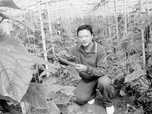 近日,太康县王集乡返乡农民工王鹏正在采摘即将上市的黄瓜。数月前,在南方沿海城市打工的王鹏提前返乡,在该县工商部门的扶持下,贷款10多万元,承包10多亩地建了一座反季节蔬菜大棚。 记者 孙安平 摄
