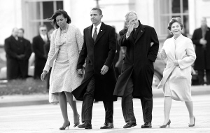 美国总统奥巴马与前任总统布什道别 1月20日,奥巴马夫妇(左)送别布什夫妇(右)。