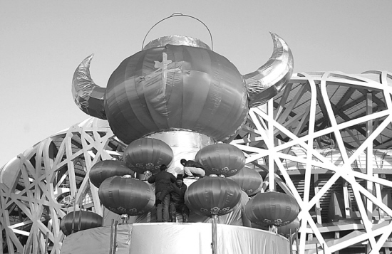 春节临近,一组大型牛年主题灯笼在北京国家体育场“鸟巢”前亮相,营造出一派喜庆热烈的节日气氛。 新华社发
