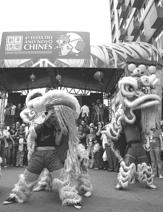 世界各地喜迎新春佳节 1月24日,在巴西圣保罗市中心自由广场举行第四届“中国年”庆祝活动上,业余演员表演中国传统的舞狮。 新华社记者 陈威华 摄