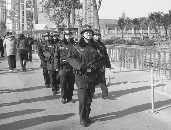 为确保春节期间市区社会治安稳定,增强人民群众的安全感,让人民群众过上一个平安、祥和、快乐的新春佳节,市公安局有针对性地在市区重点部位、重点时段和案件多发地段开展武警巡逻。图为民警在市区街道巡逻。(孙安平 摄)