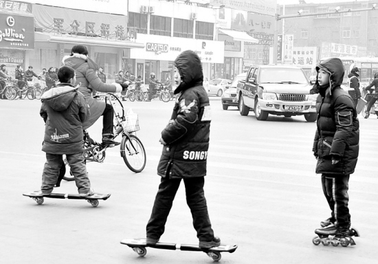 近日,记者在市区七一路、八一路等主要道路看到,有一些小孩子滑着滑板在行人和车辆间穿梭,路人无不为他们捏了一把汗。有市民认为,家长应该加强教育,引导孩子注意安全,以免发生意外。 记者 孙安平 摄