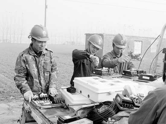 近日,扶沟县掀起抗旱浇麦的高潮。图为该县韭园镇电管所接到一麦田用电困难的报告后,连续工作24小时,为该麦田架好线路,让农民顺利浇麦抗旱,受到农民好评。 (谷志方 摄)