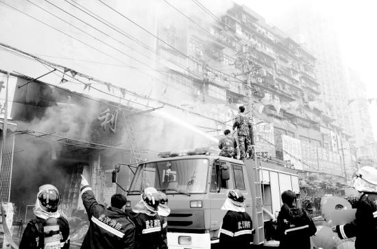 2月5日9时50分左右,武汉汉正街一塑料玩具和工艺品市场发生大火,目前至少造成10人受伤,其中一人伤势严重。当地消防部门介绍说,消防部门组织了79辆消防车,公安、消防官兵800多名迅速赶赴现场施救,到12时左右明火扑灭。这是消防队员正在现场扑救。 新华社记者 熊金超 摄