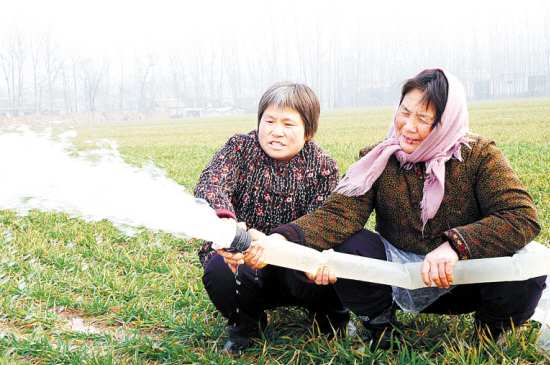 淮阳县充分利用农田机井通电工程的抗旱设施,动员群众积极投入抗旱保苗工作中去。图为该县大连乡刘楼行政村的村民在利用电灌设施浇麦。(张瑜 摄)