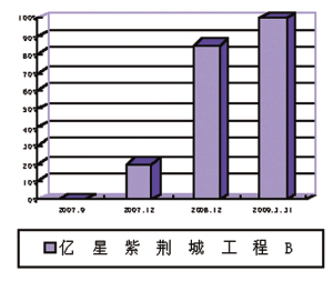 2009年是亿星房地产公司紫荆城项目建设承上启下、持续发展的重要一年,经过两年的开发运作,亿星·紫荆城主体工程将全部竣工,上下水、雨污水管网工程全面完工,景观绿化工程完成施工并在当年基本达到设计效果,物业公司接管、物业管理正式启动,紫荆城业主全面入驻。亿星·紫荆城——这座凝聚亿星集团全体职工心血的高档住宅小区,在历经两年的开发建设后,将全面呈现规划设计理念,正式交付业主入住,同时,认真做好紫荆城二期项目的谋划和设计。