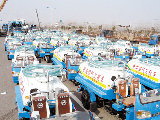 扶沟县能源办为解决农民用沼气抽渣难问题,利用沼气国债项目资金购买了97辆抽渣车,配备给村级沼气服务网点,从而减少了农民的开支,方便了沼气用户。图为卸车现场。(谷志方 摄)