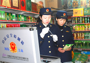 为严厉打击经销过期变质、有害和不合格食品等违法行为,切实有效维护群众利益,确保和谐稳定的消费环境,近日,市工商部门加大了流通环节食品安全监管力度。图为市工商局荷花分局执法人员正在用食品安全检测箱检测商品质量。记者 王映 摄 线索提供:范承志