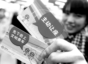 迎世博 上海轨道交通印制“文明车票” 2月25日,乘客在轨道交通上海人民广场站展示“文明车票”。当日,上海轨道交通部门开展“迎世博,文明乘车”活动,首次将文明乘车提示语印在车票上,倡导市民文明乘车。 新华社发