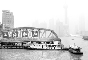 百年外白渡桥开始回归原位 2月25日,外白渡桥北段桥身在雨中停靠至原位。当日,修缮完毕的上海外白渡桥钢结构北段桥身再次“坐上”千吨驳船,从浦东的上海船厂移回苏州河原位,整个桥体复原工作将在三天内完成。始建于1907年的外白渡桥是苏州河汇入黄浦江口的第一座钢桥,也是见证上海滩百年沧桑的著名地标。 新华社记者 陈飞 摄