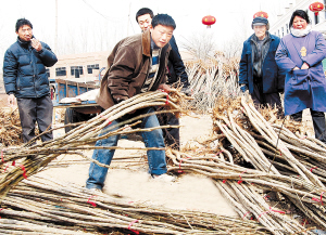 ▲鹿邑县郑集乡李庄行政村村民正在挑选杨树苗。近来,该县在林权改革、土地流转工作中优先帮扶计生户和困难户,带领他们共同致富。