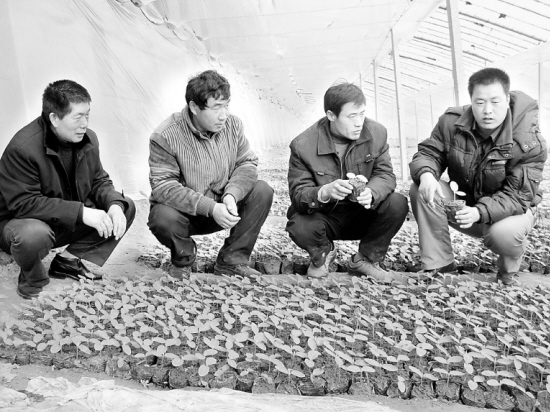 近期天气变化较大,对各类农作物造成了不同程度的影响,扶沟县积极组织科技人员来到田间地头、塑料大棚内指导农民进行春季保苗,确保农作物不受冻害。图为扶沟县蔬菜局的技术人员在与农民一起研究温棚蔬菜苗子保温措施。 谷志方 摄