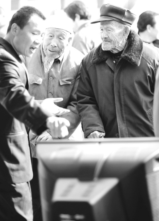 2月28日,一位经销人员向宁夏贺兰县立岗镇两位老农介绍“家电下乡”产品。当日,宁夏“家电下乡”活动在宁夏贺兰县立岗镇正式拉开序幕。新华社发