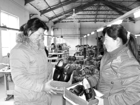 商水县妇联以“阳光工程”为依托,积极为返乡女民工送温暖、送信息、送技术、送岗位、送政策,使不少打工妹实现了再就业的梦想。图为袁老乡干部在向女工马丽(右)了解鞋厂的运营情况。 (刘飞 摄)