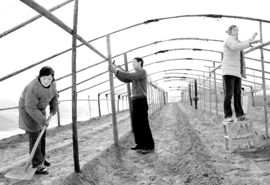 3月5日,鹿邑县李庄村李团结一家正在搭建新的日光蔬菜大棚,准备今年大干一场。该县像李团结这样的近千户返乡农民工得到了该县财政局、计生协提供的资金、技术等综合服务,在家乡上项目搞创业。 (满金玉 摄)