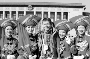 靓丽风景线 3月5日,一名外国友人在北京人民大会堂前与为两会服务的工作人员合影留念。 新华社记者 谢环驰 摄