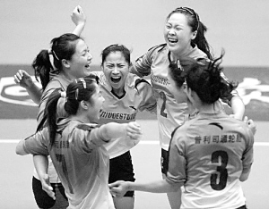 3月8日,2008——2009年全国女排联赛总决赛最后一场比赛在天津市人民体育馆进行,天津队以3比2战胜上海队,从而以总比分3比1夺得冠军。这是天津女排第六次夺得联赛冠军。 新华社记者 郭勇 摄