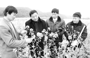 万名农技员田头送科技 3月5日,一名农技员(左二)在江西鄱阳县石门街镇石门村油菜地里指导农民加强对油菜的后期管理。针对持续的阴雨天气对油菜生长不利的情况,江西省农业部门及时组织各地1万多名农技员深入到田间地头,指导农民搞好对油菜等作物的后期管理,深受农民欢迎。 新华社发