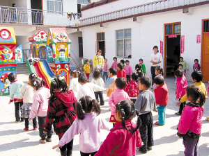 为让父母在外放心务工,郸城县大力实施关爱农村留守儿童工程,该县建起了高质量、高标准的农村幼儿园,让留守儿童和城里的孩子们一样健康成长,解除了在外务工人员的后顾之忧。图为该县虎岗乡常营村幼儿园的小朋友们在上室外活动课。(王雪涛 摄)